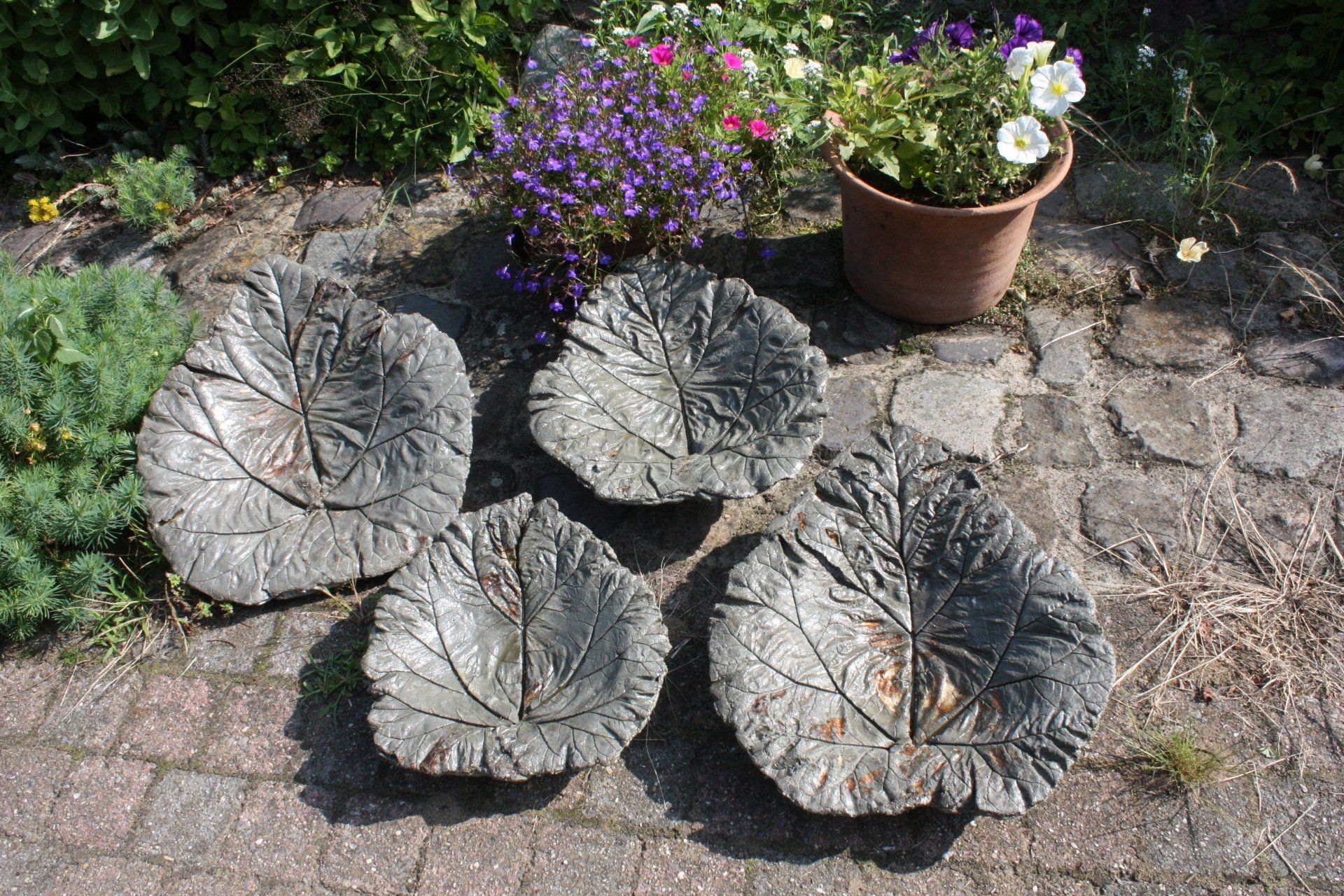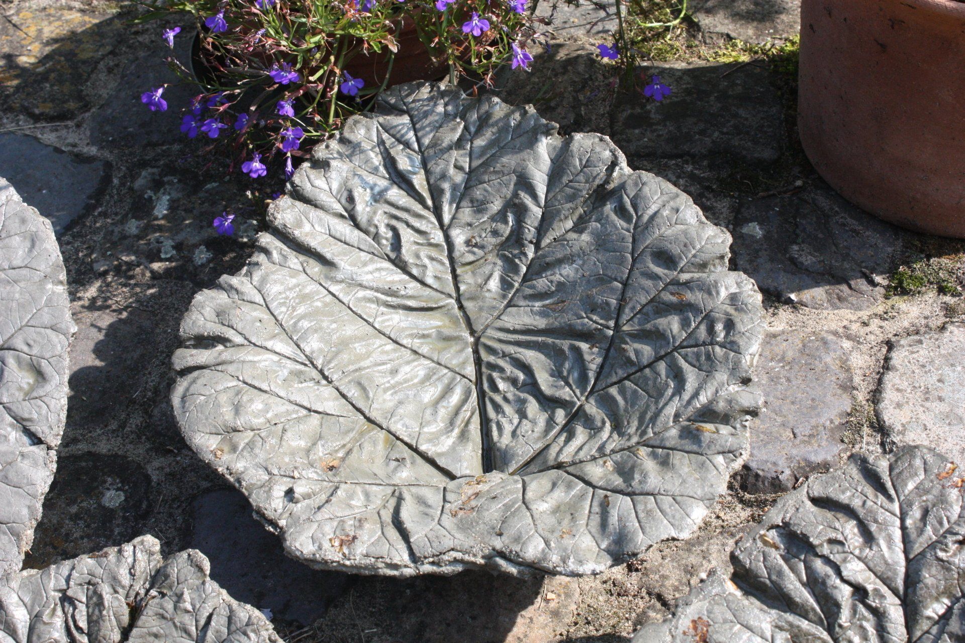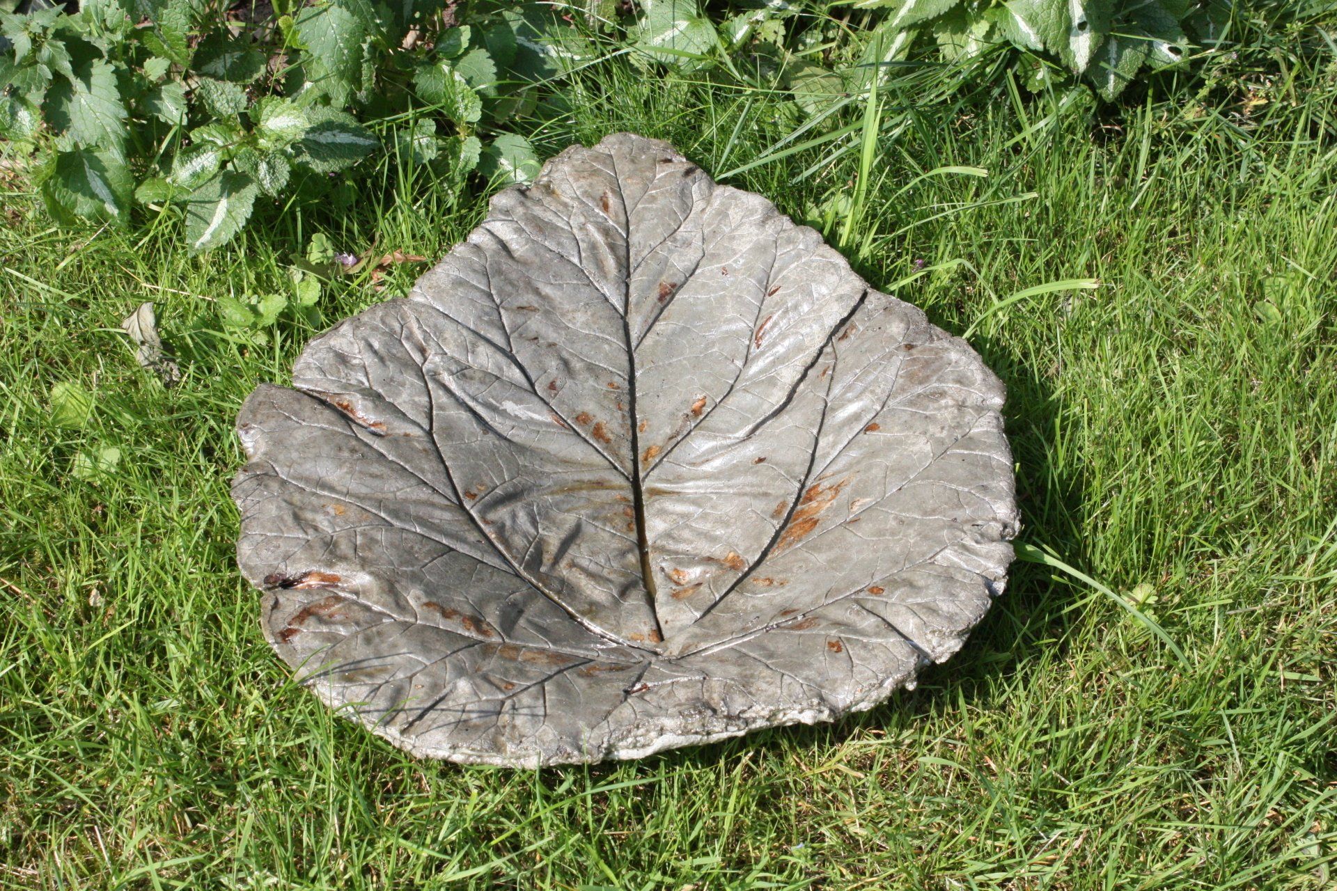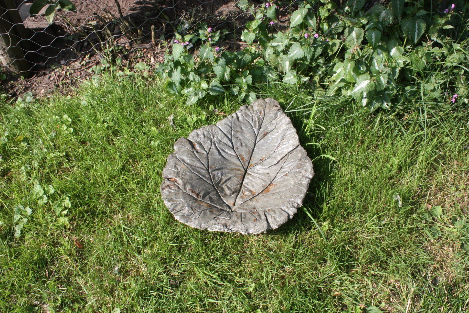 Van een rabarberblad en cement maak ik een vogelbad waar iedere vogel graag op af komt!